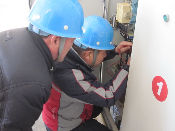 圖為工人們在進行現場檢查 針對青口鹽場揚水工對開關柜工作原理了解甚少的情況,青口供電所利用時下正值揚水淡季之機,主動到泵站現場,為揚水工詳細講解開關柜的工作原理,并對開關柜是否存在隱患進行檢查。(宋中文)