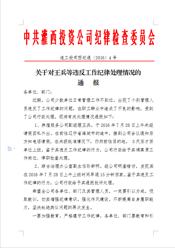 關(guān)于對(duì)王兵等違反工作紀(jì)律處理情況的通報(bào)