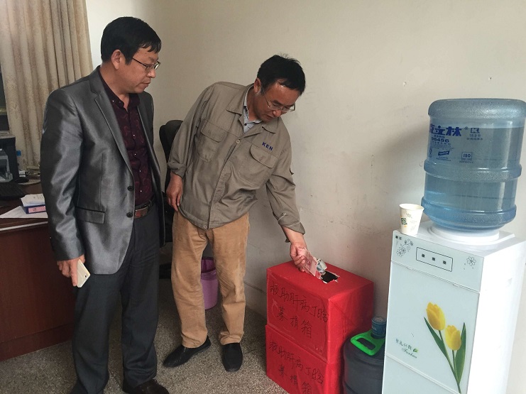 6月1日下午,新河分會主任帶著一百余名員工的委托,鄭重地將籌集上來的愛心款投入捐款箱中。(新河制鹽程龍)