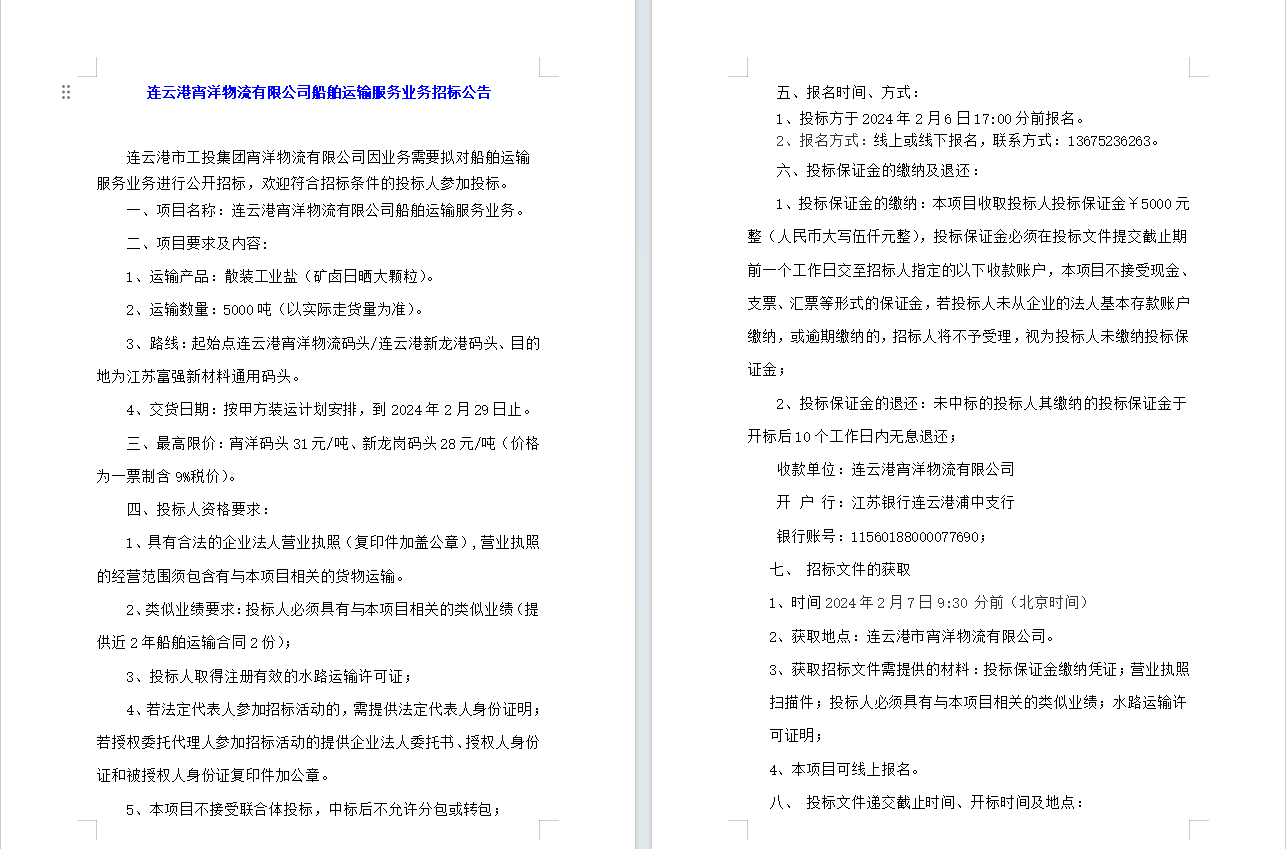 連云港宵洋物流有限公司船舶運輸服務業務招標公告