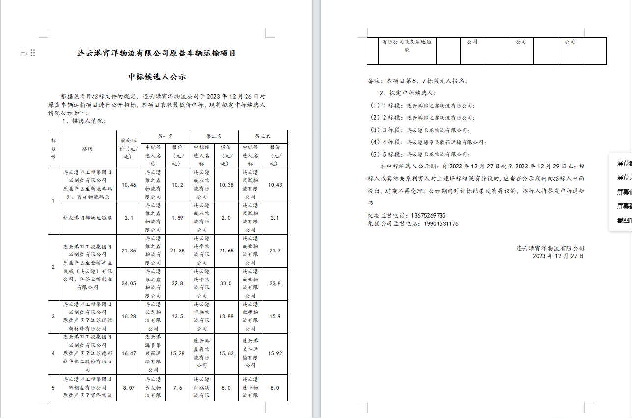 連云港宵洋物流有限公司原鹽車輛運輸項目中標候選人公示