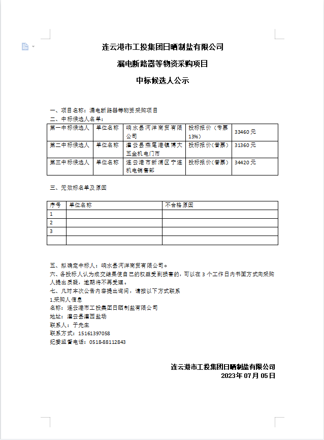 連云港市工投集團(tuán)日曬制鹽有限公司漏電斷路器等物資采購項(xiàng)目中標(biāo)候選人公示