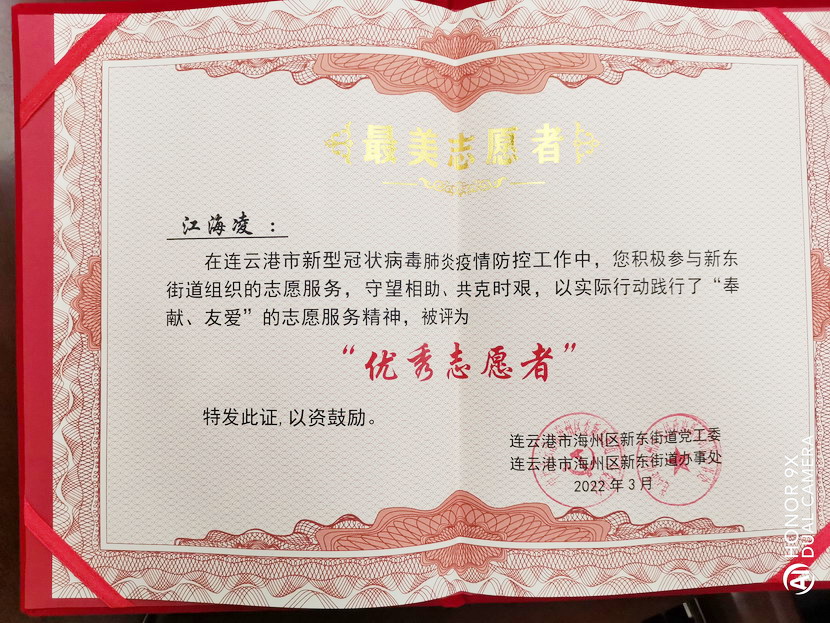 近日,港城成功戰(zhàn)勝新冠肺炎疫情,全市“摘星”轉(zhuǎn)為低風(fēng)險(xiǎn)地區(qū)。疫情發(fā)生以來一直奮戰(zhàn)在社區(qū)抗疫一線的黨員也收獲一份喜悅,紛紛被所服務(wù)街道、社區(qū)評(píng)為“最美志愿者”等榮譽(yù)稱號(hào),江海凌就是其中優(yōu)秀代表之一。