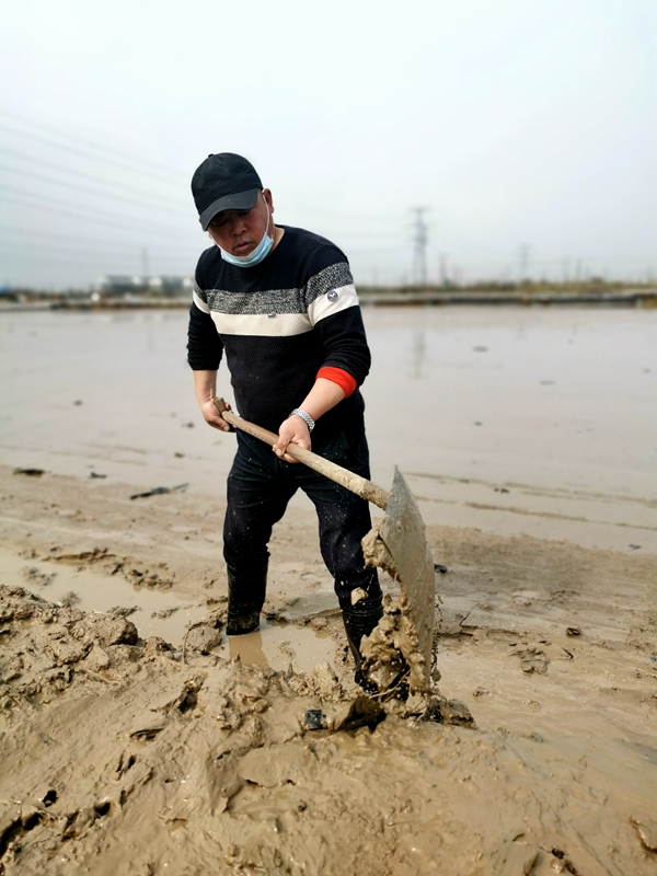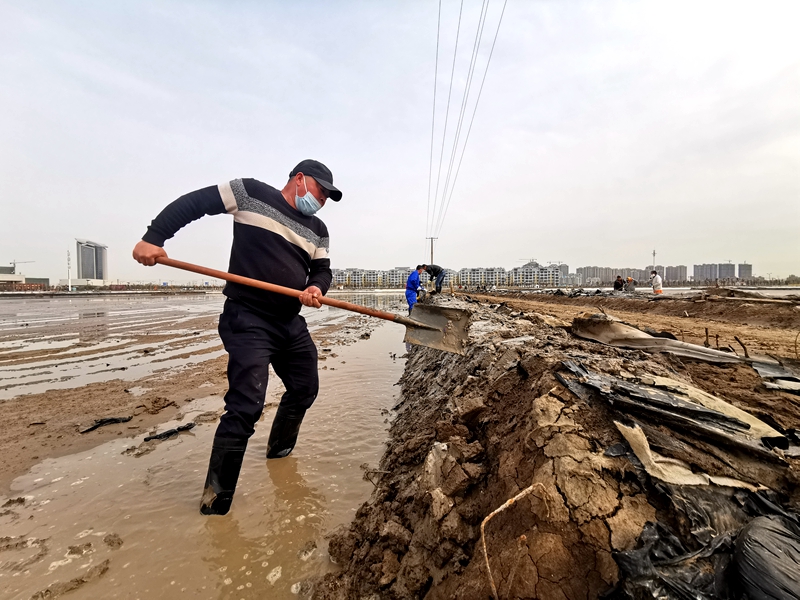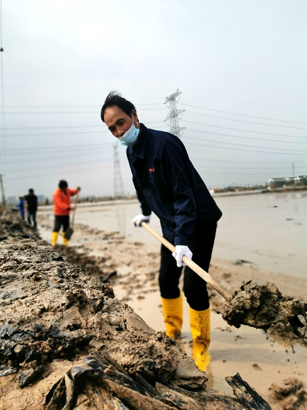 往東邊看,先鋒東灘黨旗招展分外鮮紅,海州灣公司18個單元職工、3名班組長全員出動馳援大浦工區協同重整410閑置鈣鹽灘地。引水入溝、翻泥上堰、腳踩和整、鐵掀蹋平,動作嫻熟。1200余米的10條池堰僅用一天的就順利完工。